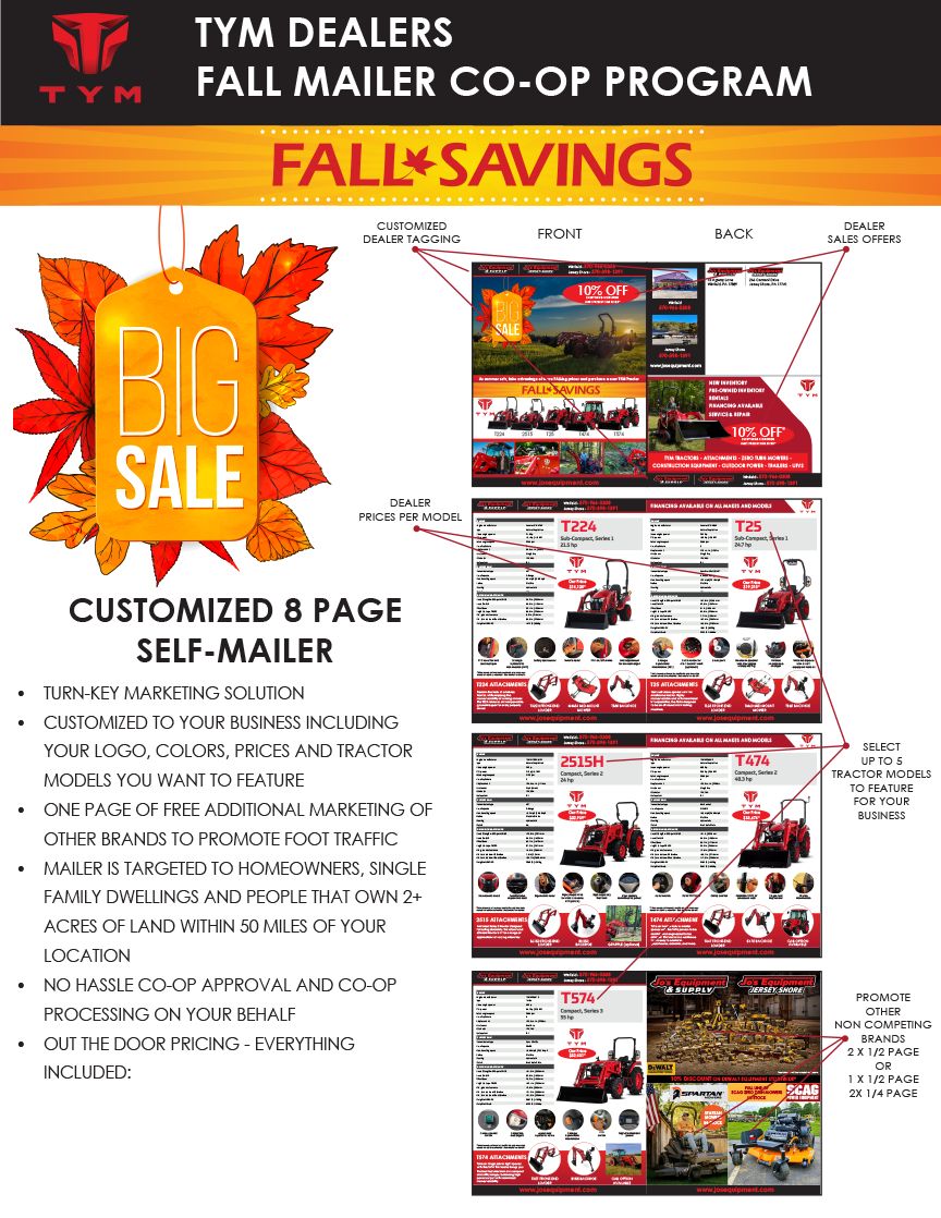 The 8-Page Mailer is an 8.5 x 11 Full Color Mailer with 8 full pages of TYM tractor models and featured dealer information. This mailer is bounded and folded to a 8.5x5x5 self mailer. Dealer's can customize the mailer with their logo, their company information, their financing and special offers as well as pick and choose which TYM model tractors that they want to feature.