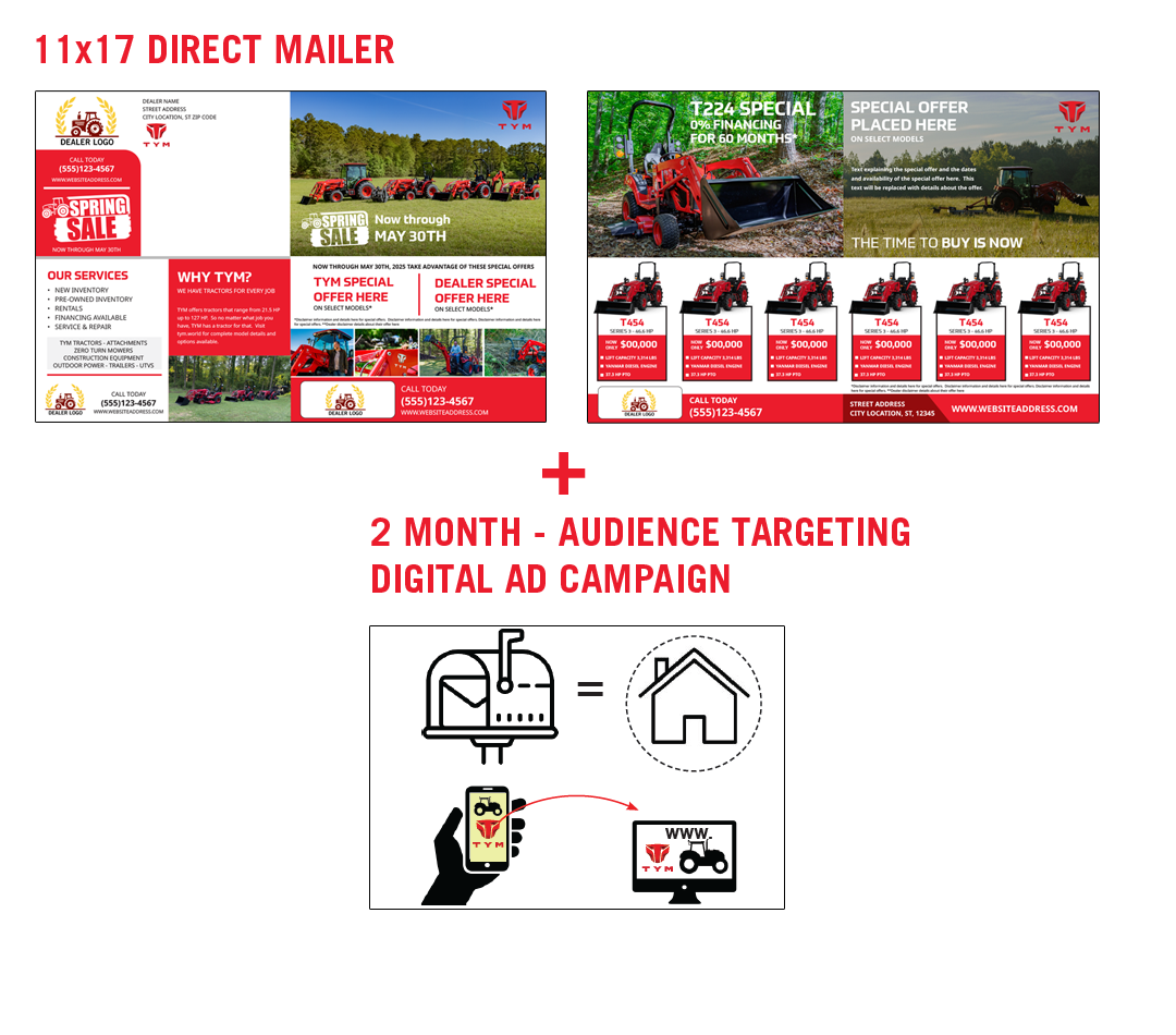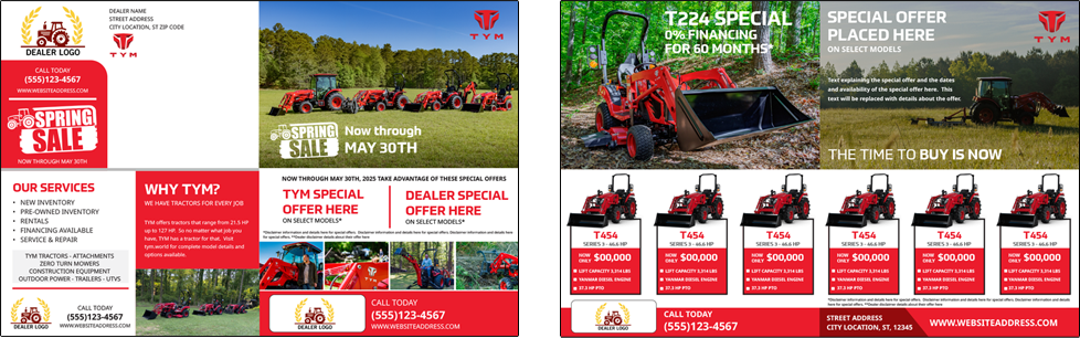The 11X17 Mailer is Full Color Mailer that folds to 8.5x5.5 self-mailer featuring TYM tractor models and dealer information. Dealer's can customize the mailer with their logo, their company information, their financing and special offers as well as pick and choose which 6 TYM model tractors that they want to feature.