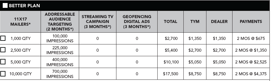 With this special program, TYM is changing the rules to your benefit. TYM will pay upfront for the 50% portion of the program. The dealer will only be billed for THEIR portion. So in this example $2,500. But wait there is more! In addition to only being billed for half of the cost of the package, Mach One Media Group as partners with TYM is offering up to 2 monthly payments for that portion. So now as an example, you can get the $5,000 plan for only 2 payments of $1,250. We are lowering the barrier to using your co-op dollars and making it affordable to advertise all while providing a turn-key program and doing all of the work for you. We want to make it easy to do business with!