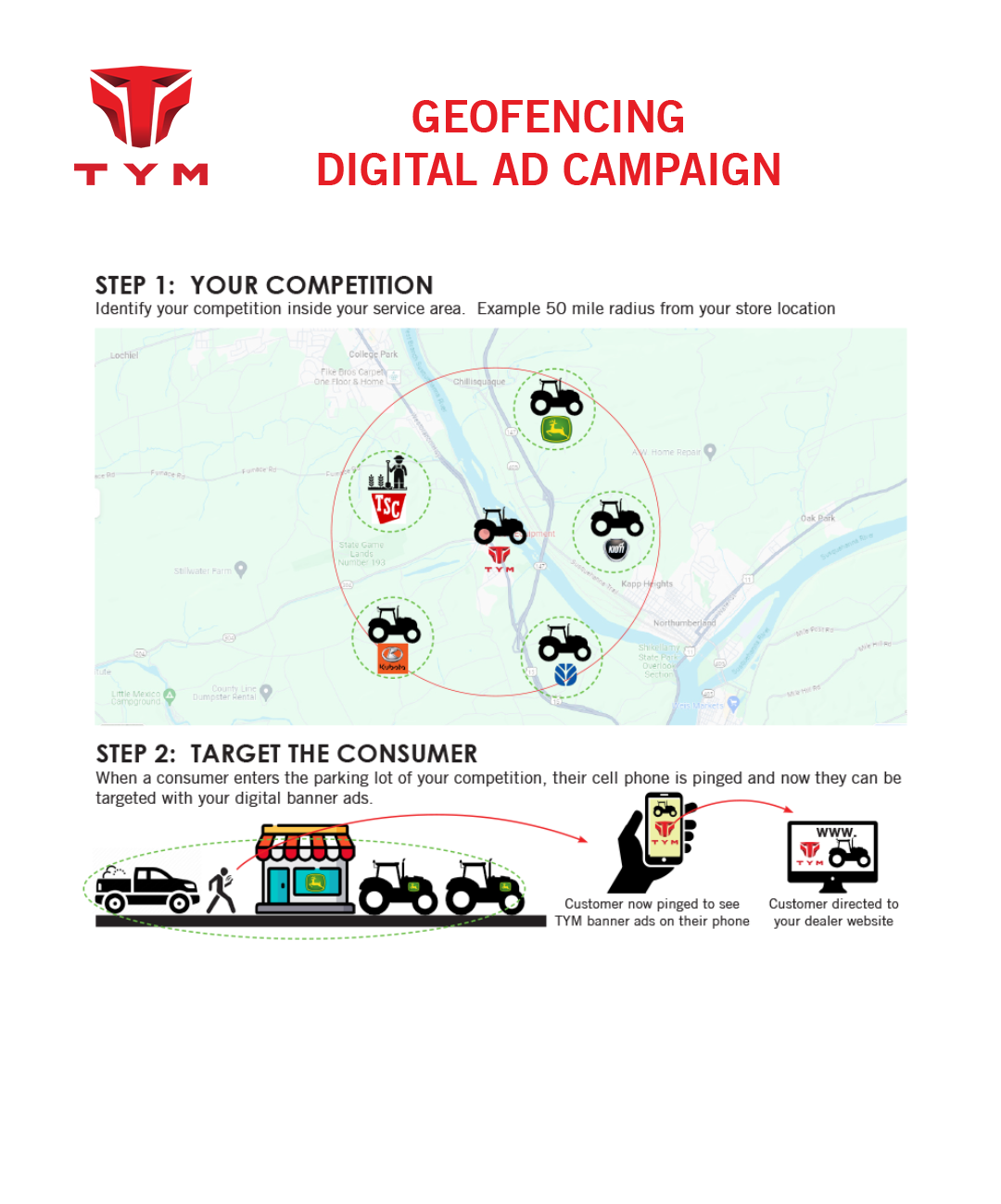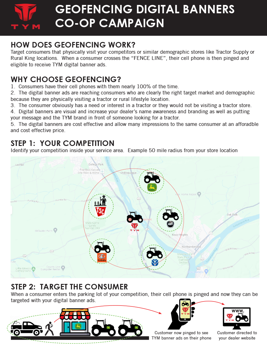 What is a Geofencing Digital Ad Campaign? Today, everyone has their cell phones on them 24/7 when they are traveling or shopping. The geofencing digital ad campaign uses that mobile phone to trigger consumers that physically visits designated locations. Within a 20 to 50 mile radius of your location, there are probably a minimum of 5 or more Tractor Stores that are your competitors and selling a different brand of tractor than you are. We identify those locations and put an imaginary "Fence" around their store. When a consumer visits that store, it triggers or "pings" that consumers cell phones which then allows us to serve the consumer digital ads for TYM and your store. If a consumer is visiting another tractor store, then its very likely that they are the right target market. This is a sniper approach to marketing becuase we know you are targeting the right person.
